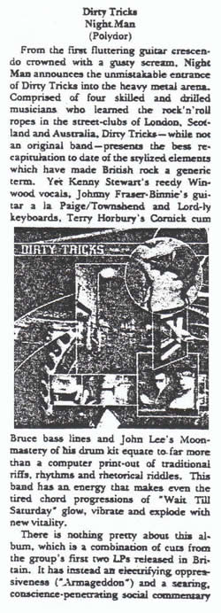 From the first fluttering guitar crescendo crowned with a gusty scream, Night Man announces the unmistakeable entrance of Dirty Tricks into the heavy metal arena. Comprised of four skilled and drilled musicians who learned the rock´n´roll ropes in the street-clubs of London, Scotland and Australia, Dirty Tricks – while not an original band – presents the best recapitulation to date of the stylized elements which have made British rock a generic term. Yet Kenny Steward´s reedy Winwood vocals, Johnny Fraser-Binnie´s guitar a la Paige/Townshend and Lord-ly keyboards, Terry Horbury´s Cornick cum Bruce bass lines and John Lee´s Monnmastery of his drum kit equate to far more than a computer print-out of traditional riffs, rhythms and rhetorical riddles. This band has an energy that makes even the tired chord progressions of “Wait Till Saturday” glow, vibrate and explode with new vitality.