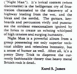 Night Man is a powerful album from a group possessing not only superior technical ability and relentless intensity, but a sense of humor as well. After all, it´s a pretty Dirty Trick to disprove the currently fashionable theory that heavy metal British rock is dead.