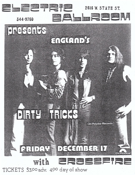 Advertisment for their concert at the "Electric Ballroom", 2616 W. State St., U.S.A. The show took place on Friday, December 17th, 1976, the other group that night was "Crossfire".