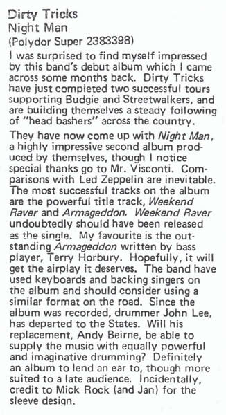 They have now come up with Night Man, a highly impressive second album produced by themselves, tough I notice special thanks go to Mr. Visconti. Comparisons with Led Zeppelin are inevitable. The most successful tracks on the album are the powerful title track, Weekend Raver and Armageddon. Weekend Raver undoubtedly should have been released as a single. My favourite is the outstanding Armageddon written by bass player, Terry Horbury. Hopefully, it will get the airplay it deserves. The band have used keyboards and backing singers on the album and should consider using a similar format on the road. Since the album was recorded, drummer John Lee, has departed to the States. Will his replacement, Andy Beirne, be able to supply the music with equally powerful and imaginative drumming? Definitely an album to lend an ear to, though more suited to a late audience. Incidentally, credit to Mick Rock (and Jan) for the sleeve design.