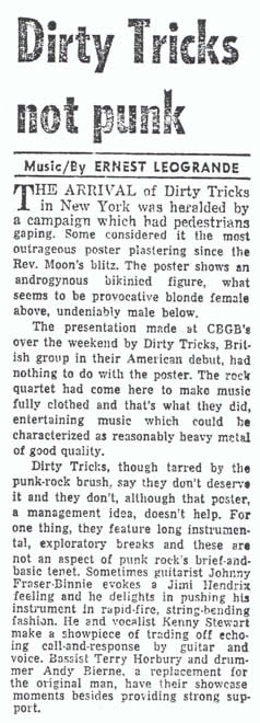 The presentation made at CBGB´s over the weekend by Dirty Tricks, British group in their American debut, had nothing to do with the poster. The rock quartet had come here to make music fully clothed and that´s what they did, entertaining music which could be characterized as reasonably heavy metal of good quality.