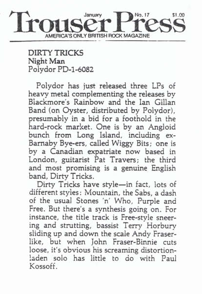 Polydor has just released three LP´s of heavy metal complementing the releases by Blackmore´s Rainbow and the Ian Gillan Band (on Oyster, distributed by Polydor), presumably in a bid for a foothold in the hard-rock market. One is by an Angloid bunch from Long Island, including ex-Barnaby Bye-ers, called Wiggy Bits; one is by a Canadian expatriate now based in London, guitarist Pat Travers; the third and most promising is a genuine English band, Dirty Tricks.